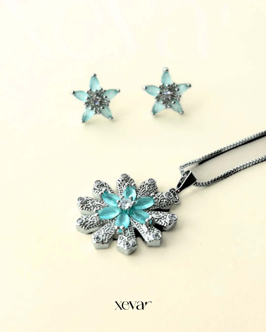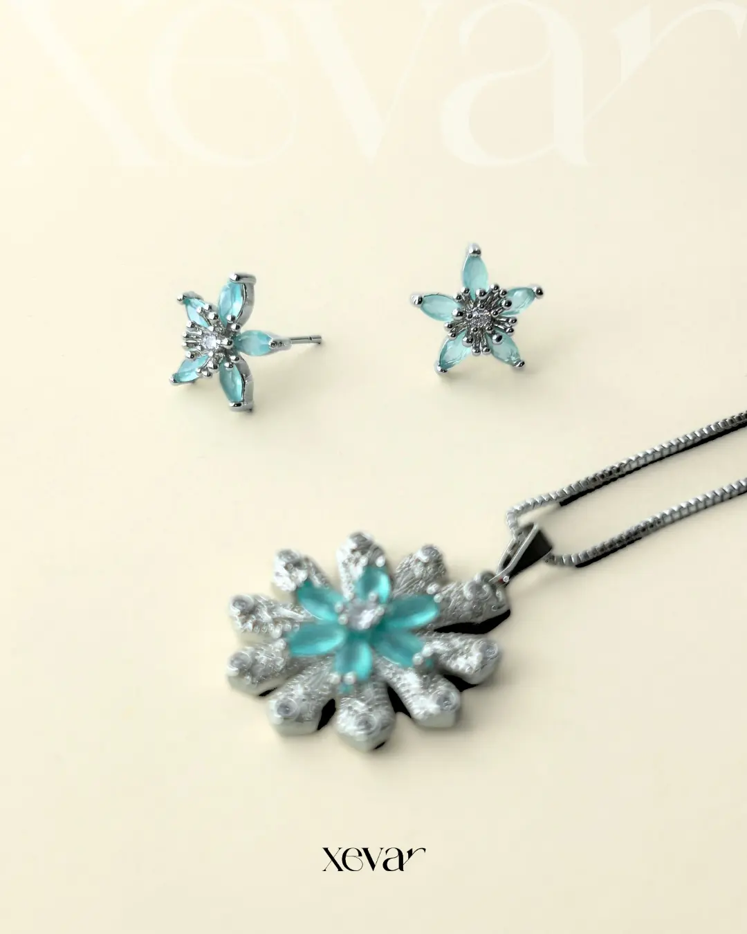 A light-blue floral earring and pendant set with marquise-cut petals, sparkling crystals, and detailed silver accents—perfect for adding soft elegance to any outfit.