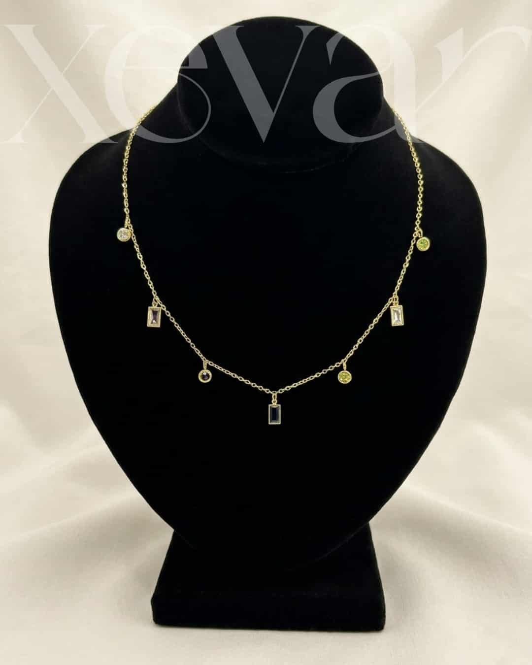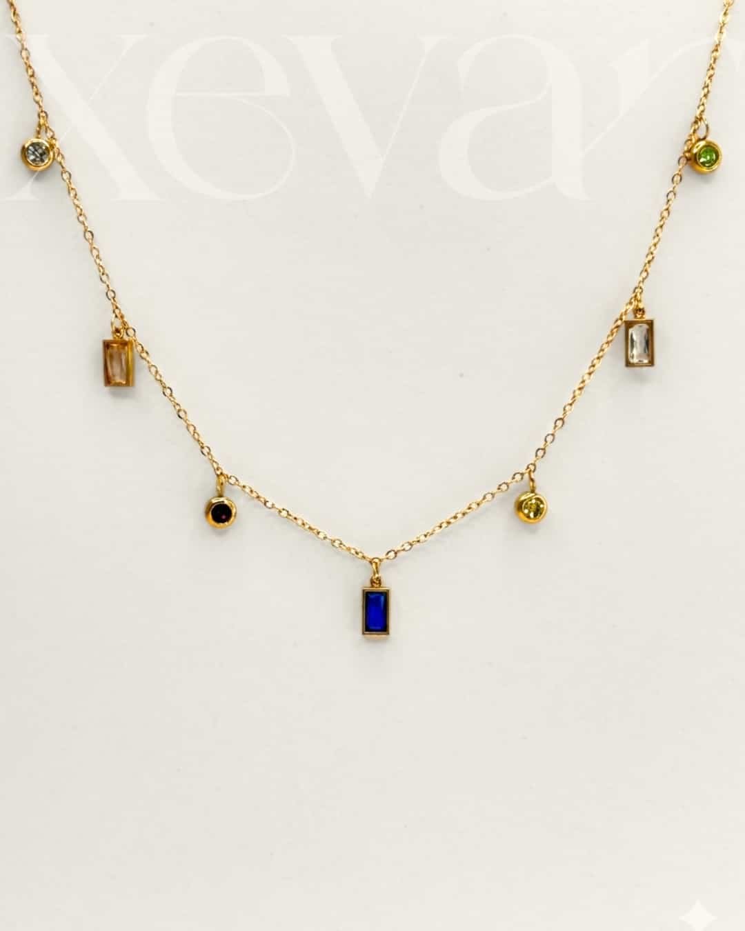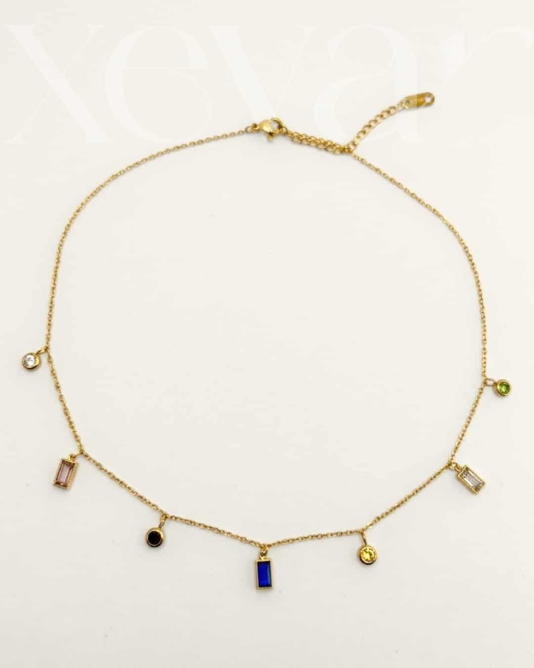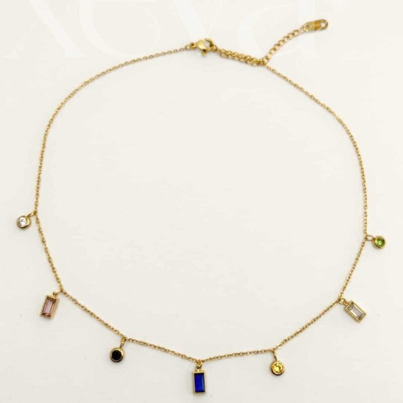 Add a splash of color to your collection with our Multicolor Gemstone Gold Necklace. This dainty piece features a curated selection of vibrant, multi-shaped crystal charms suspended from a shimmering gold-toned link chain for a playful yet elegant look.It serves as a joyful jewelry gift for a loved one or a vibrant addition to your own jewelry box, proving that a touch of colorful gold jewelry is always in style.