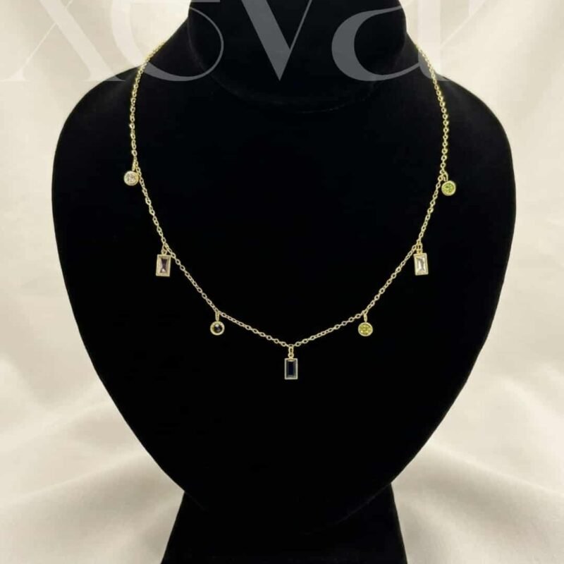 Brighten your style with our Multicolor Gemstone Gold Necklace. Featuring vibrant drop charms in sapphire, emerald, and ruby tones on a delicate gold chain. Whether you are brightening up a casual daytime look or adding a focal point to a minimalist evening outfit, this necklace offers a masterclass in playful, sophisticated styling.