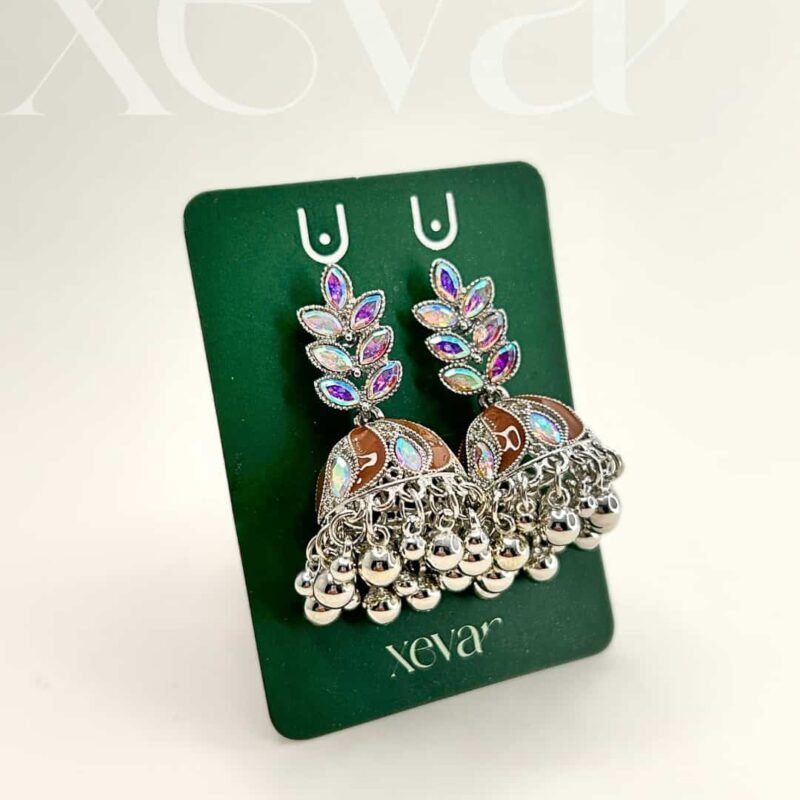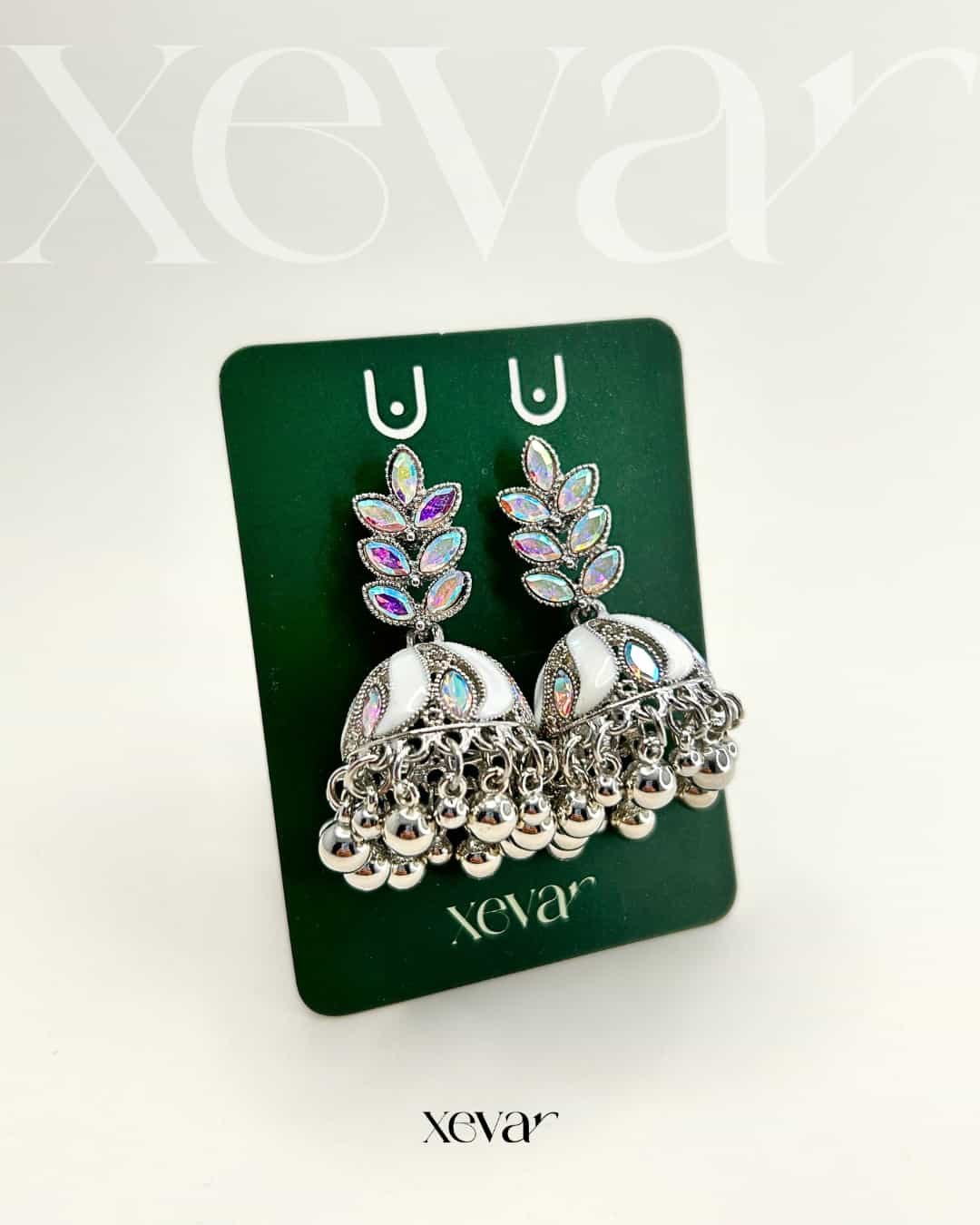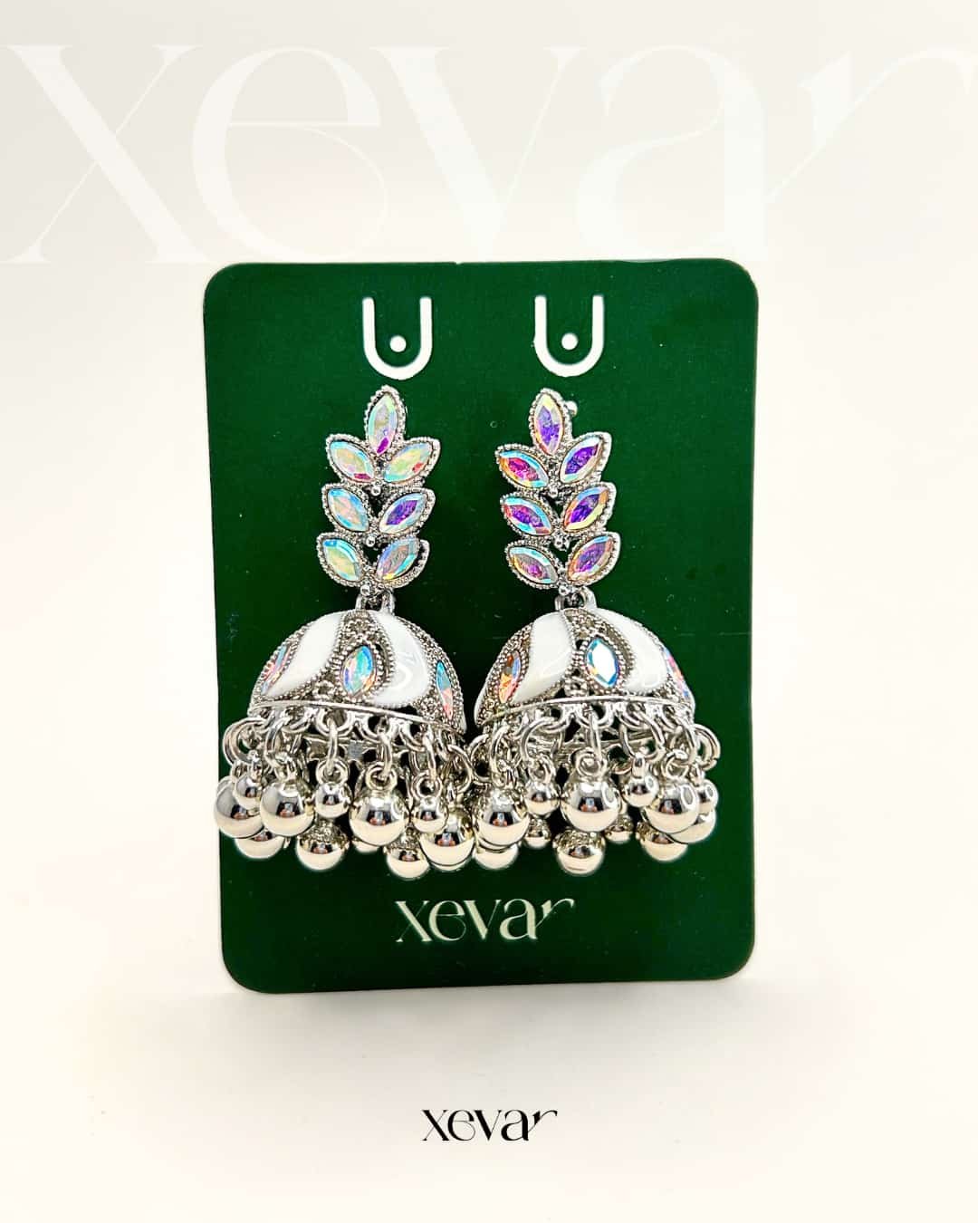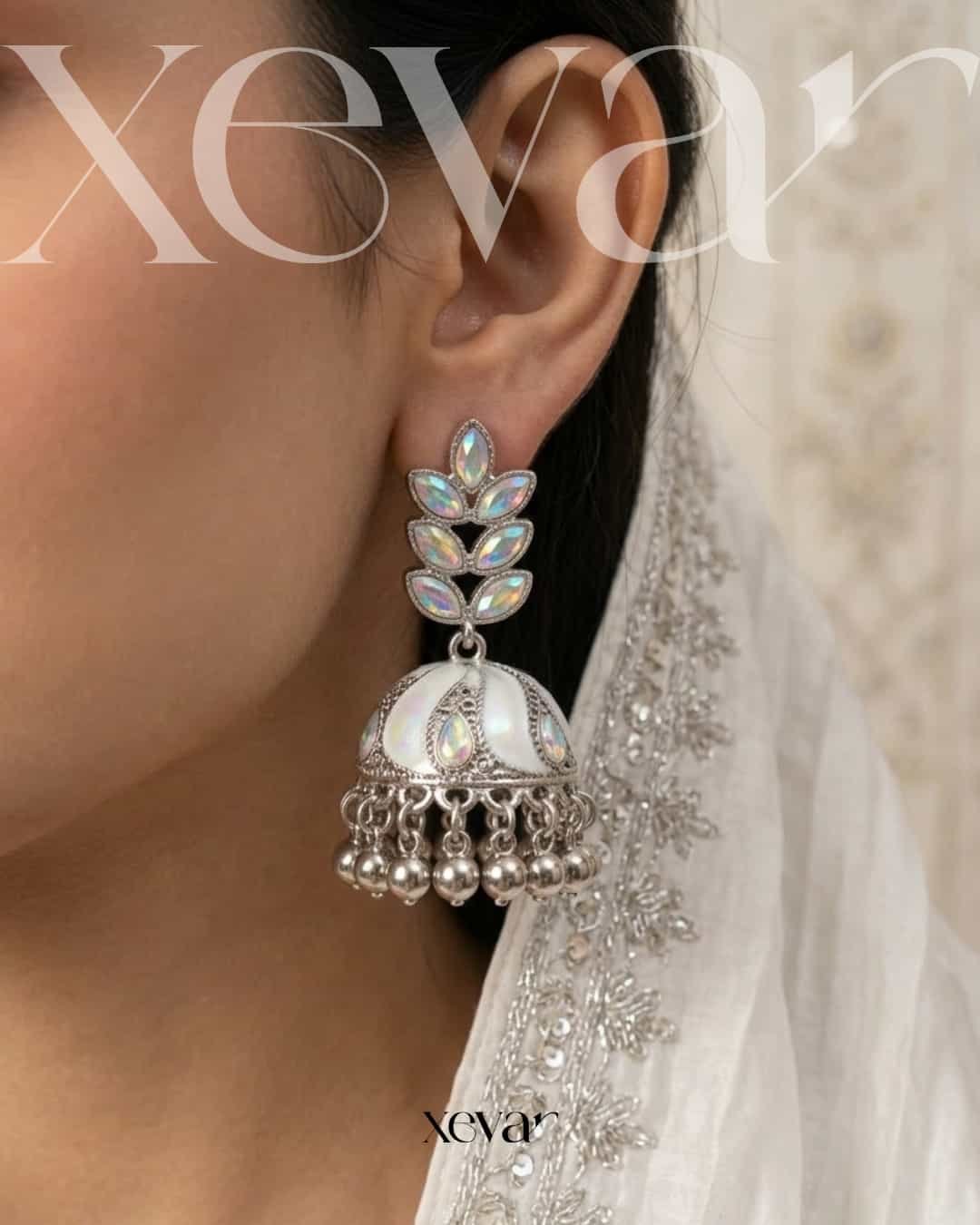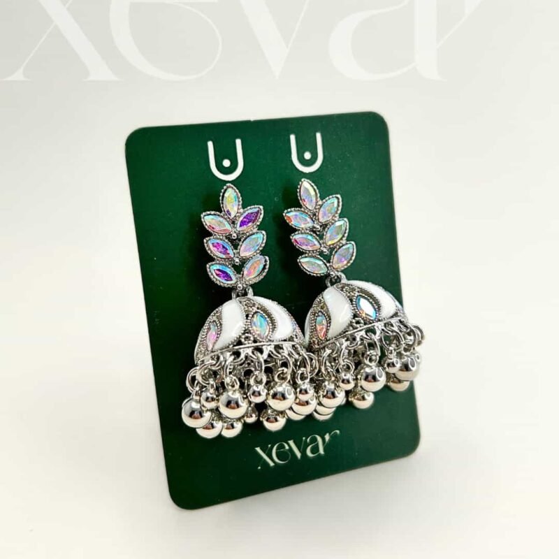 Everleaf Jhumka Earrings. Features shimmering holographic stones, a clean white enamel dome, and classic silver beadwork. Perfect for festive ethnic wear. Elevate your festive look with our Iridescent Leaf  Jhumkas. These striking earrings feature a unique leaf-motif top adorned with holographic stones and a traditional white enamel dome, finished with high-shine silver beadwork