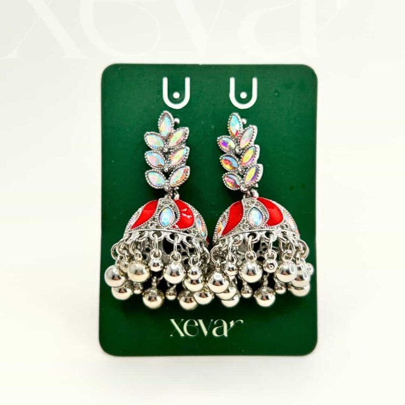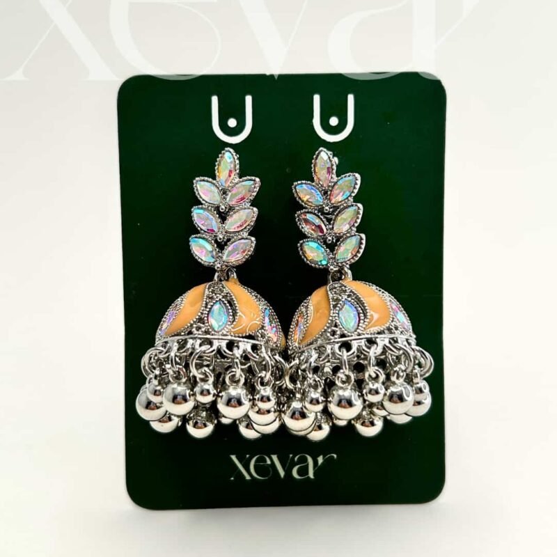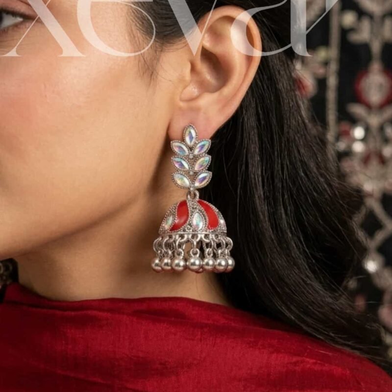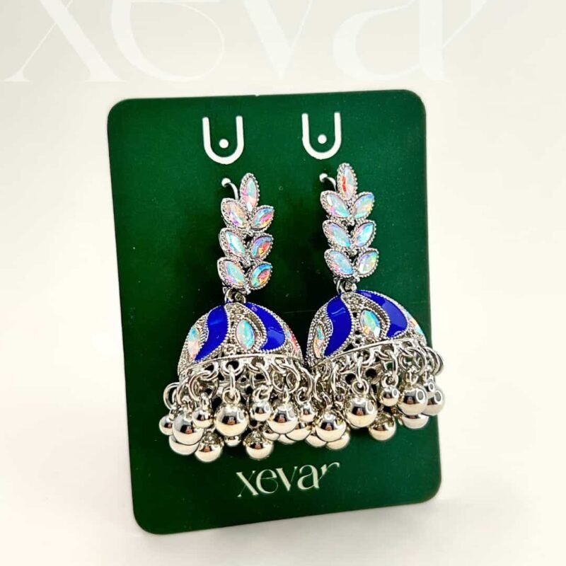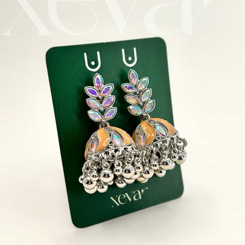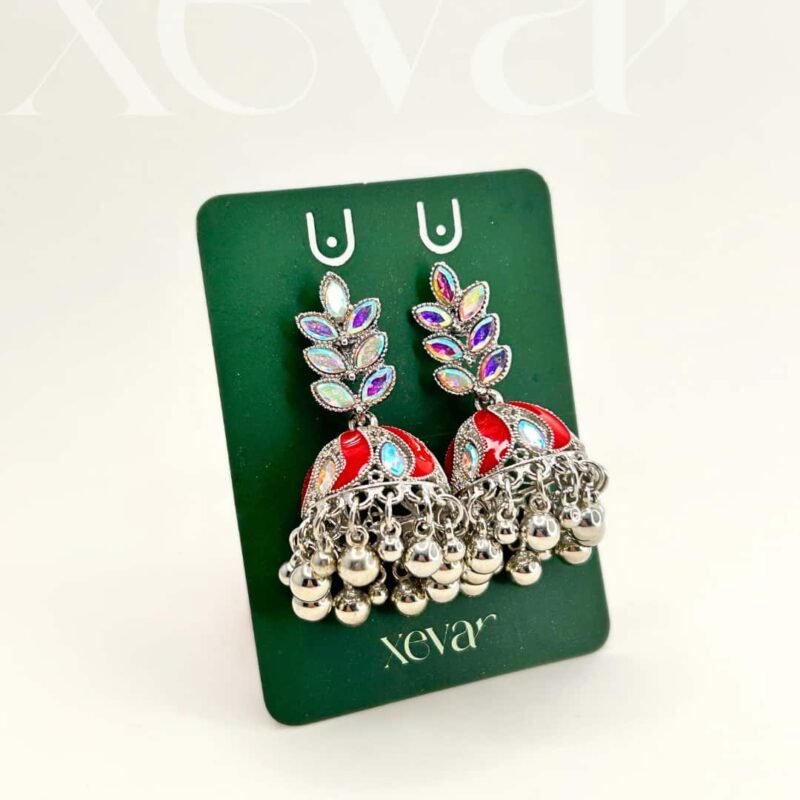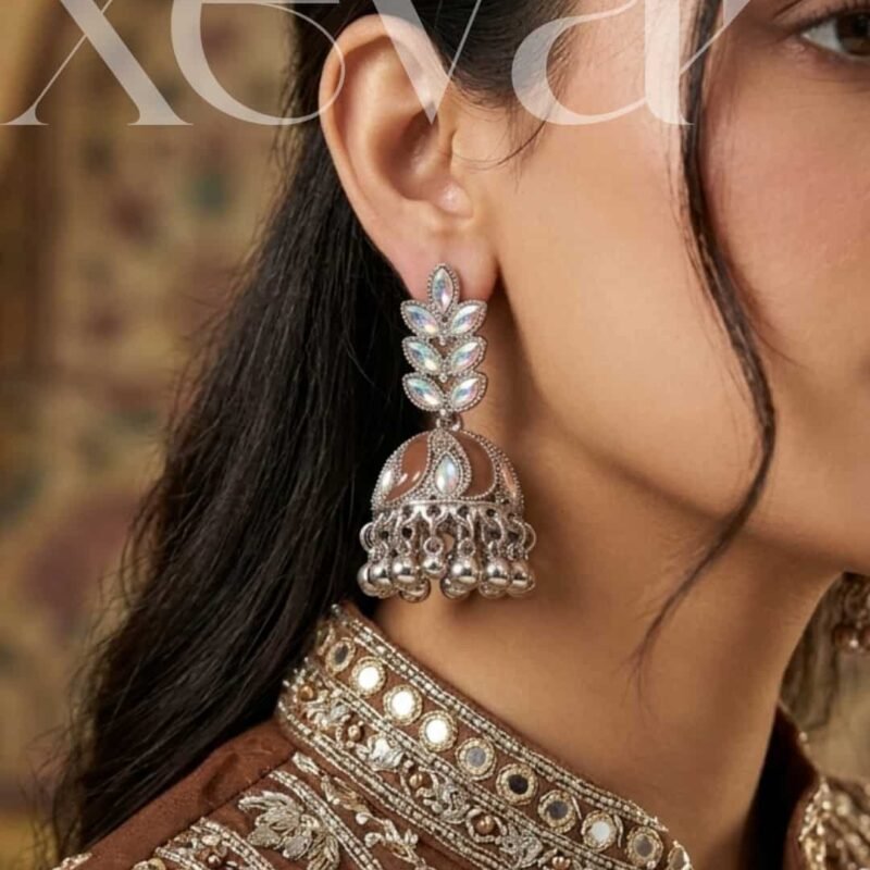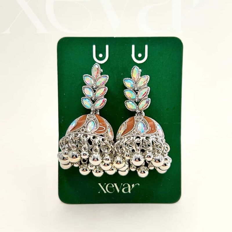 Everleaf Jhumka Earrings. Features shimmering holographic stones, a clean white enamel dome, and classic silver beadwork. Perfect for festive ethnic wear. Elevate your festive look with our Iridescent Leaf  Jhumkas. These striking earrings feature a unique leaf-motif top adorned with holographic stones and a traditional white enamel dome, finished with high-shine silver beadwork