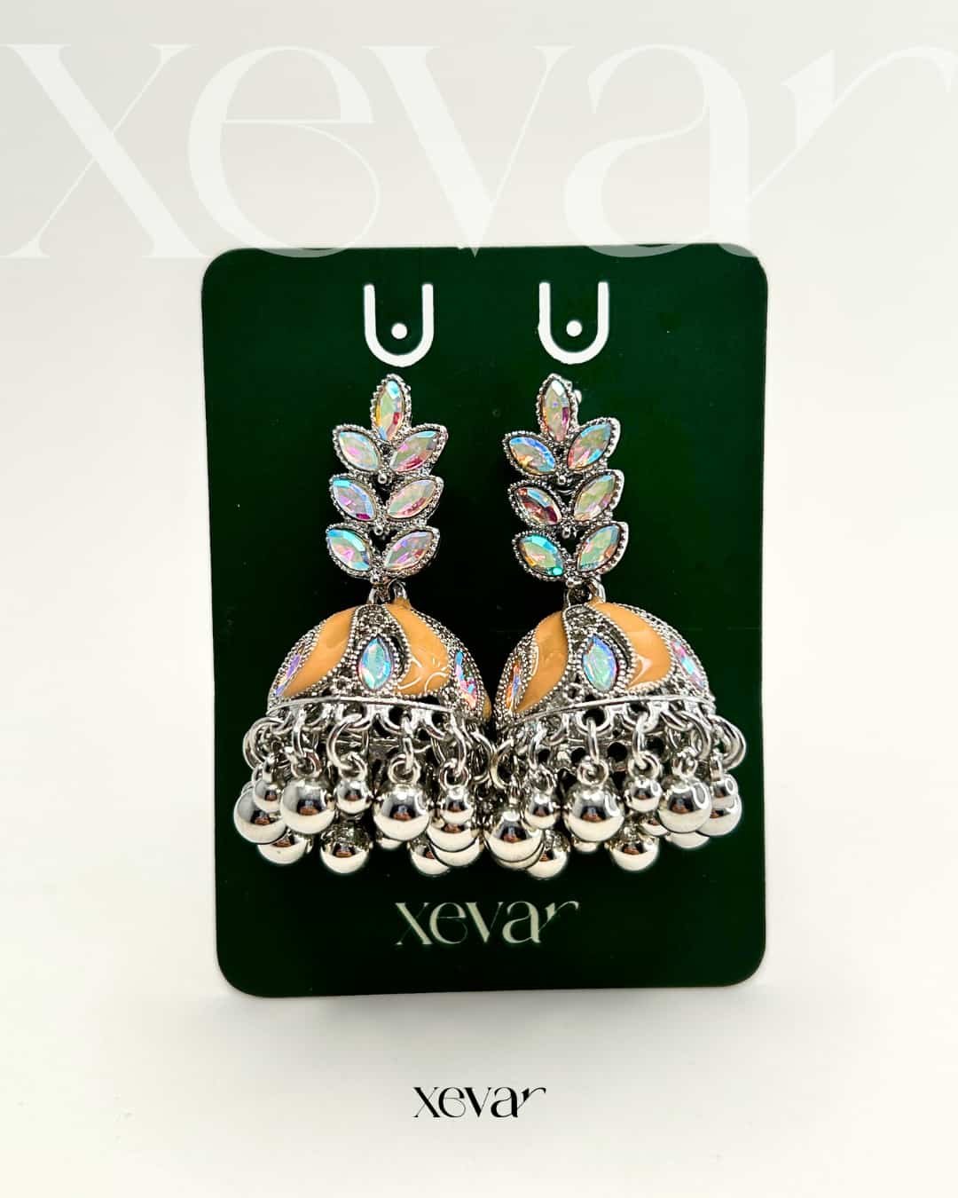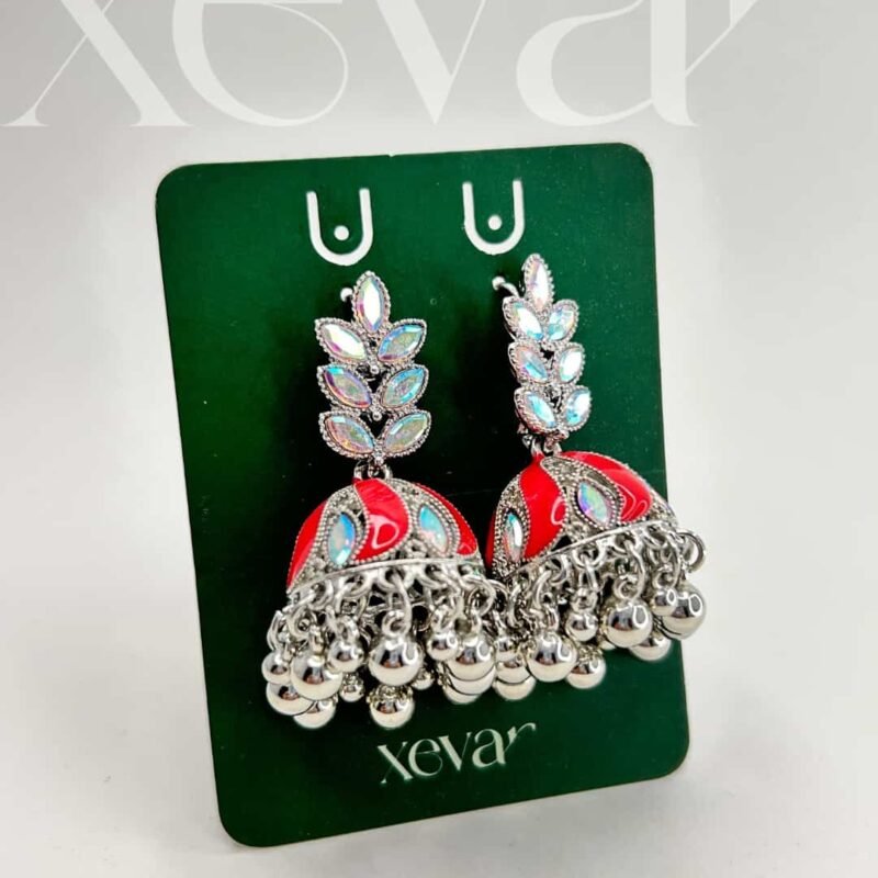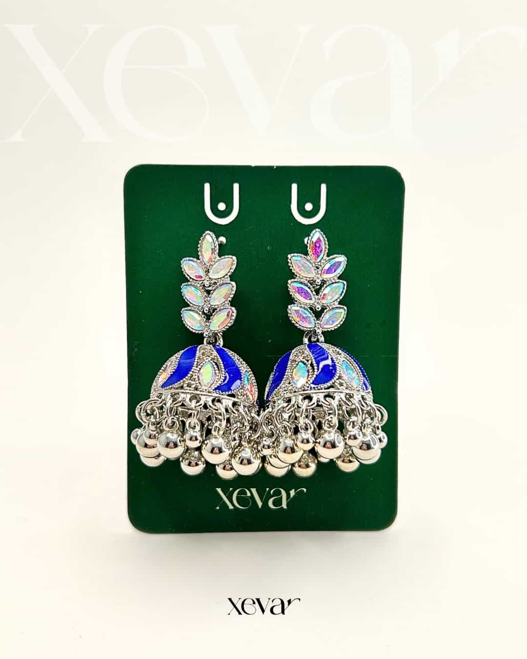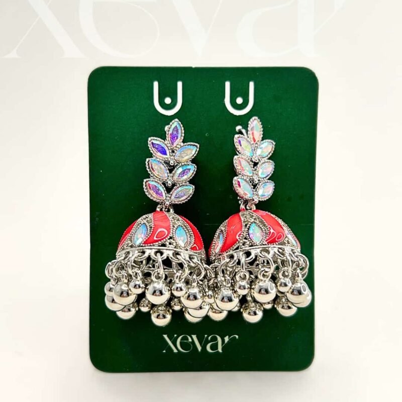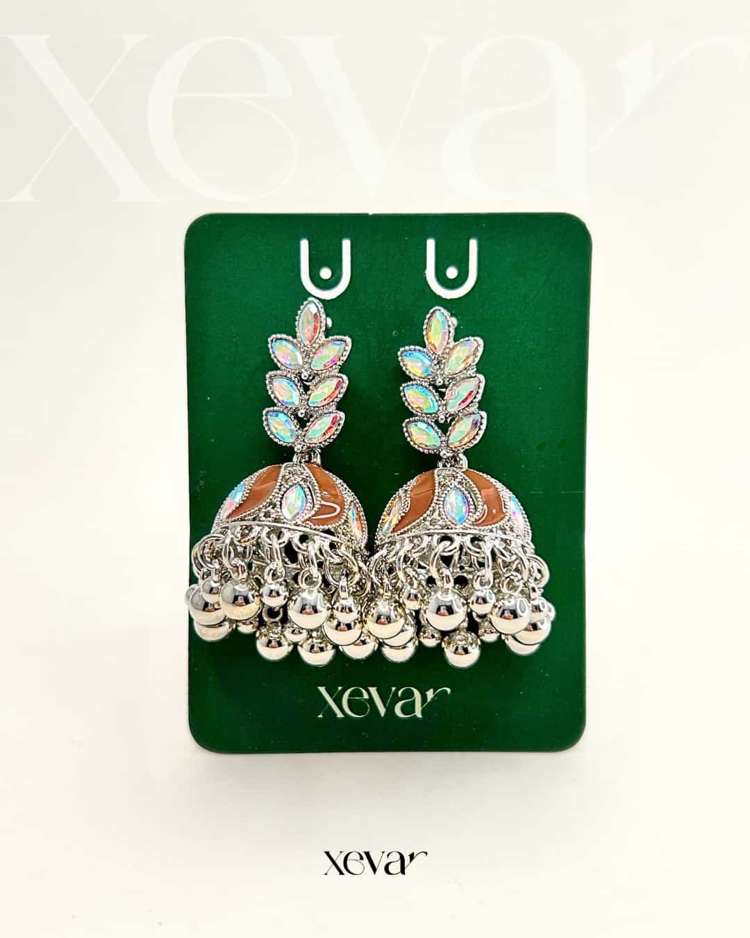 Everleaf Jhumka Earrings. Features shimmering holographic stones, a clean white enamel dome, and classic silver beadwork. Perfect for festive ethnic wear. Elevate your festive look with our Iridescent Leaf  Jhumkas. These striking earrings feature a unique leaf-motif top adorned with holographic stones and a traditional white enamel dome, finished with high-shine silver beadwork