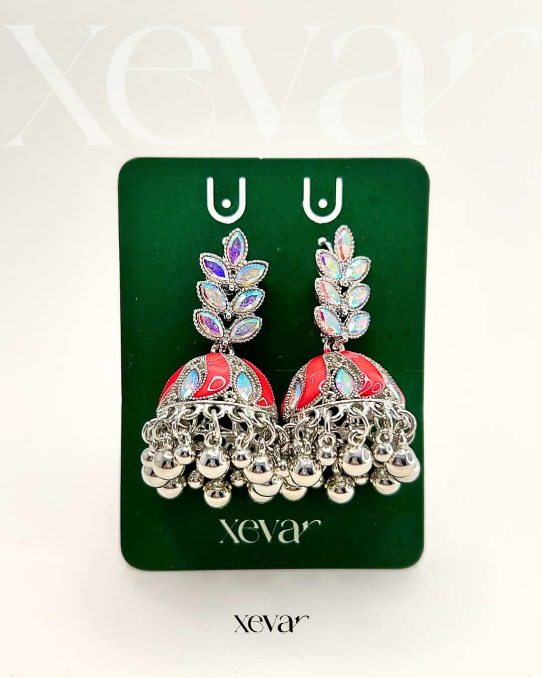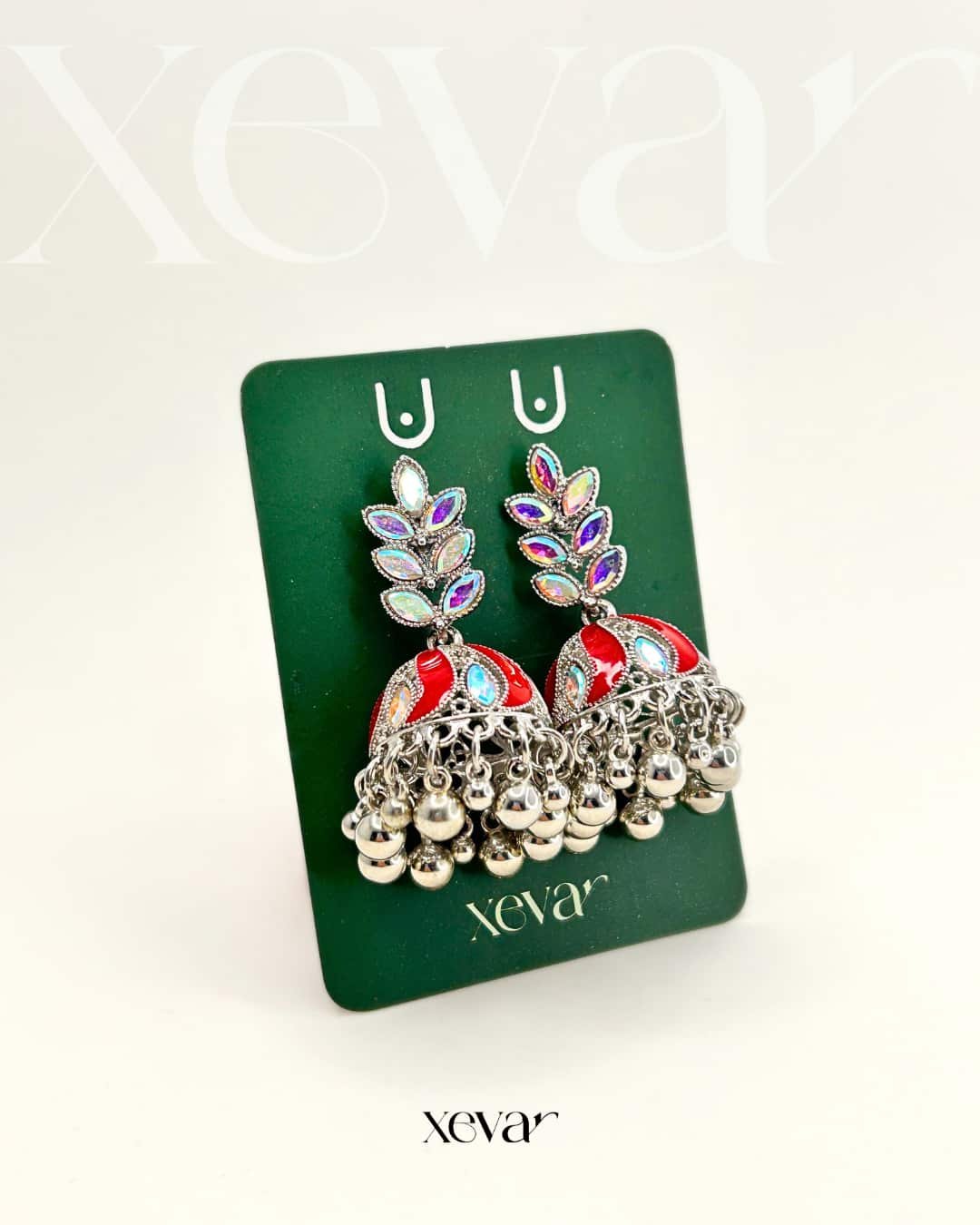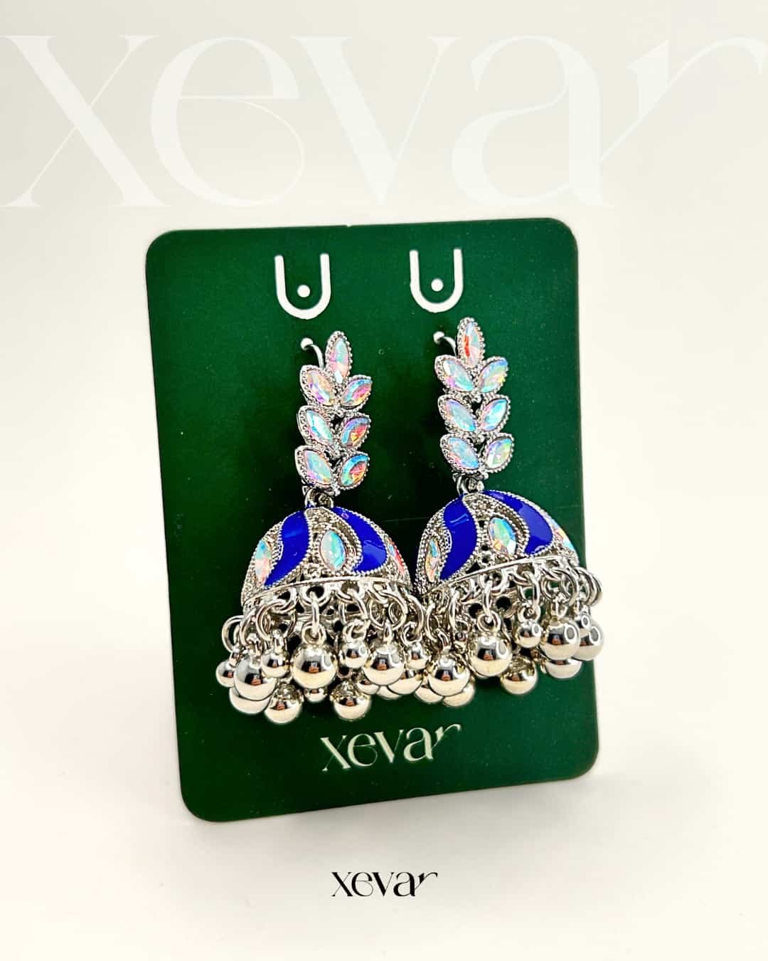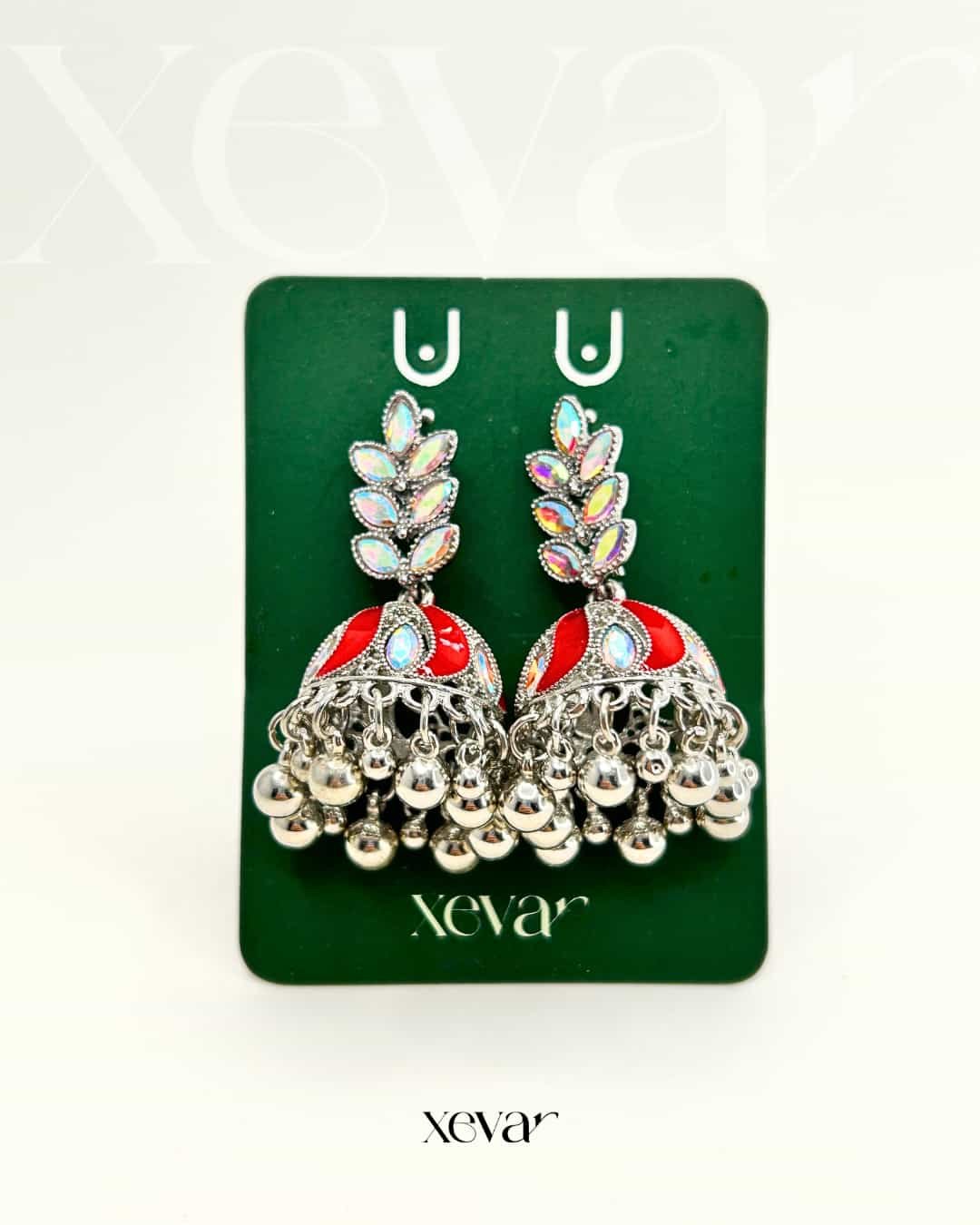 Everleaf Jhumka Earrings. Features shimmering holographic stones, a clean white enamel dome, and classic silver beadwork. Perfect for festive ethnic wear. Elevate your festive look with our Iridescent Leaf  Jhumkas. These striking earrings feature a unique leaf-motif top adorned with holographic stones and a traditional white enamel dome, finished with high-shine silver beadwork