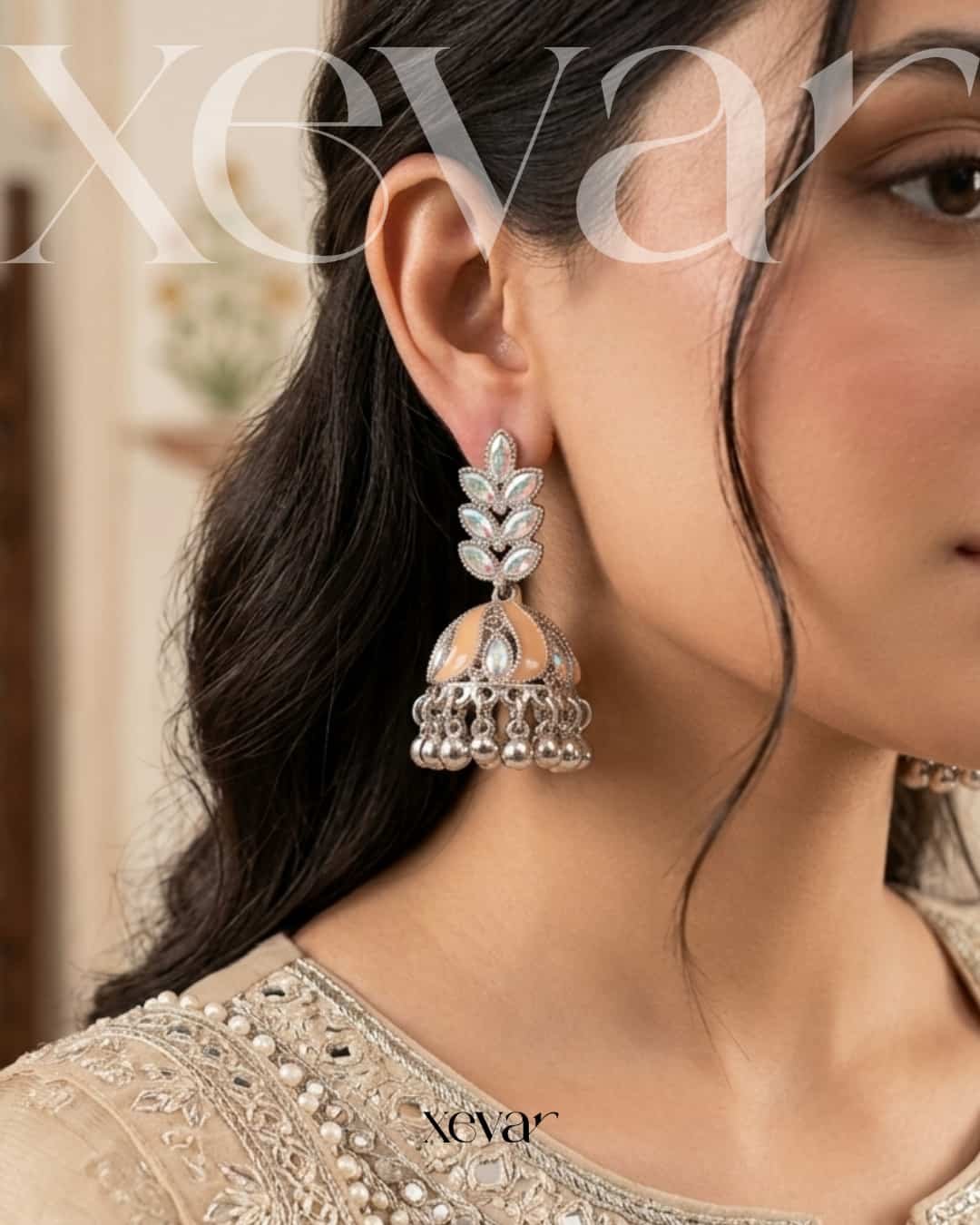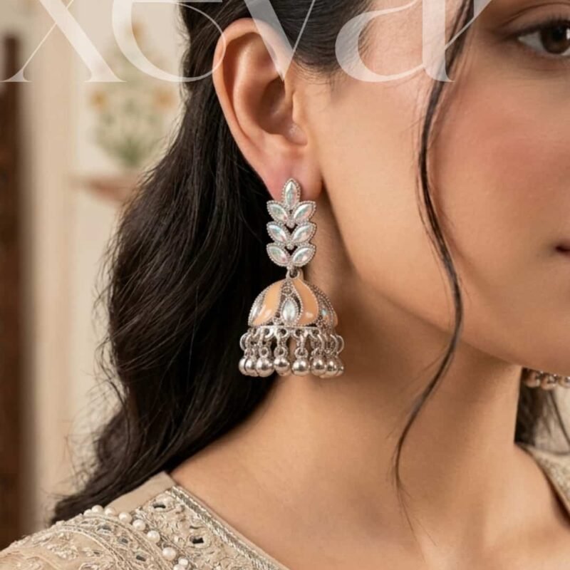 • Design Concept: A fusion of nature-inspired art and heritage jewelry, featuring a tiered leaf-motif stud that transitions into a classic bell-shaped jhumka.