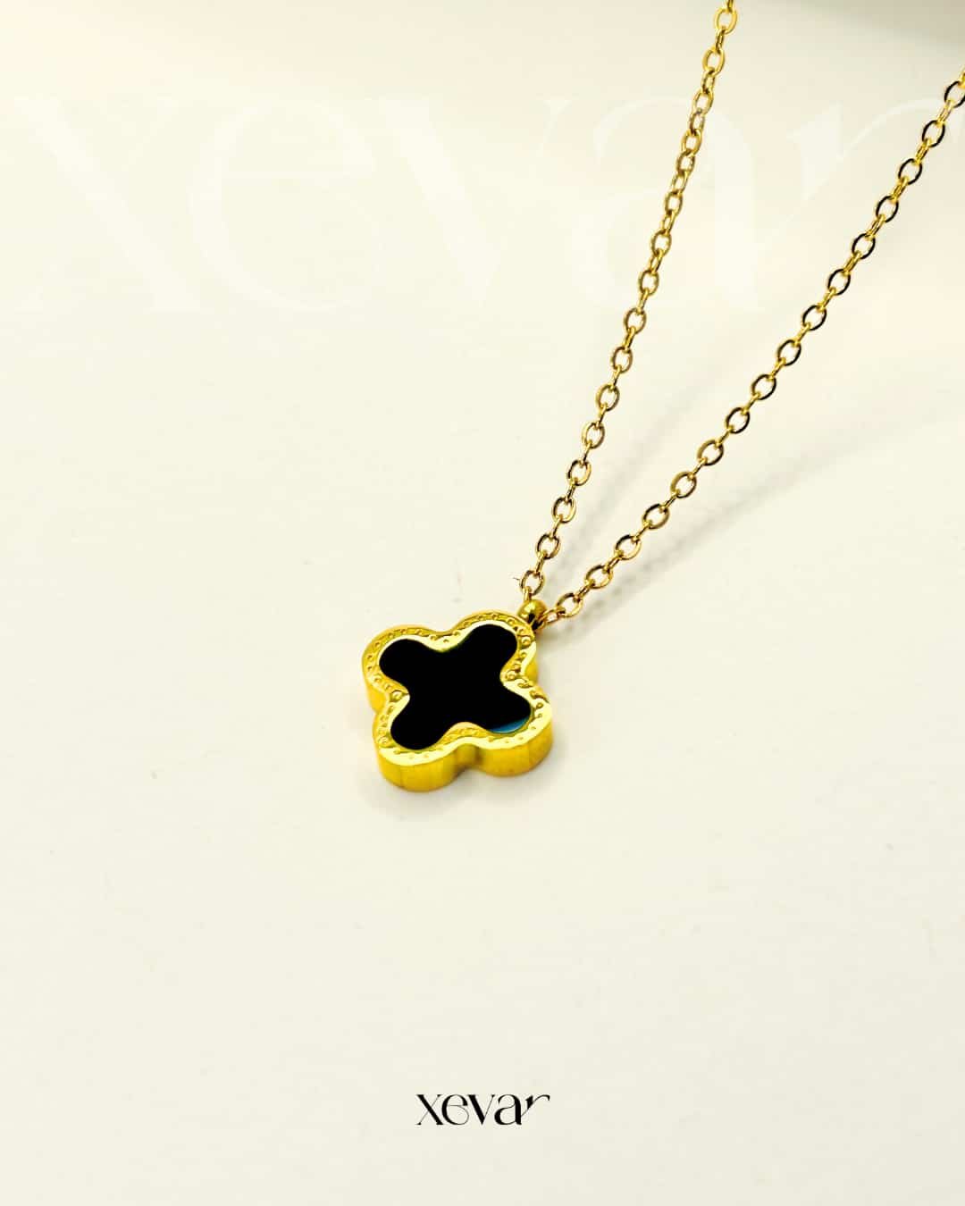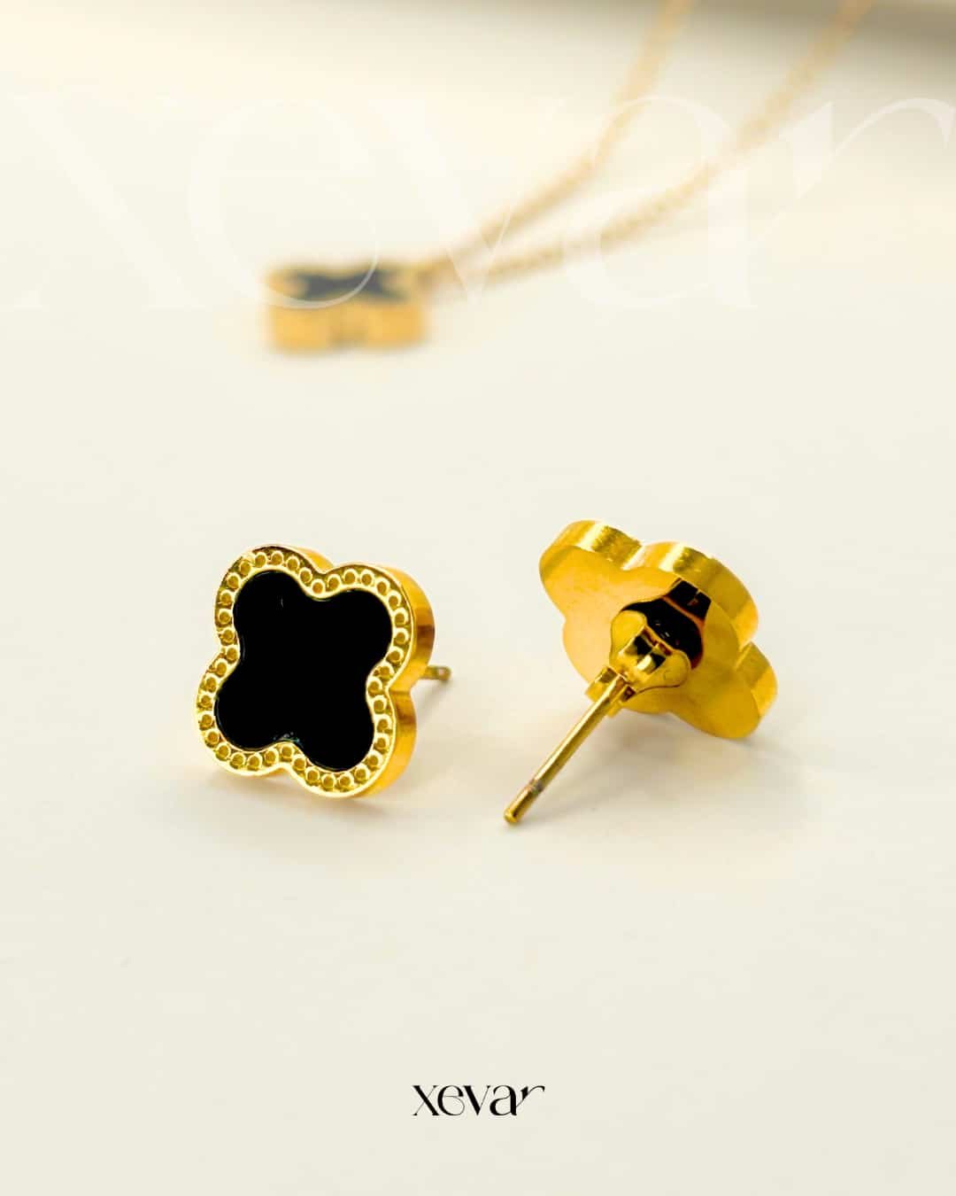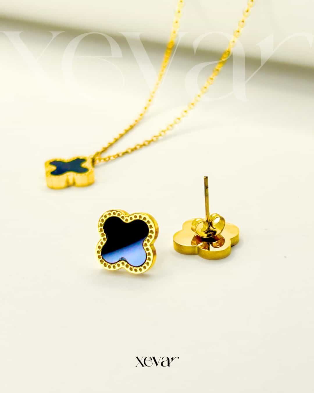 A sophisticated gold-tone jewelry set featuring iconic four-leaf clover motifs with deep onyx-black inlays and delicate beaded edging—an essential duo for effortless, high-end elegance.