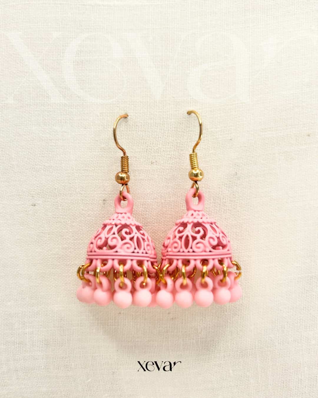 Design: Contemporary bell-shaped Jhumka silhouette featuring laser-cut floral filigree patterns for a delicate, airy aesthetic.