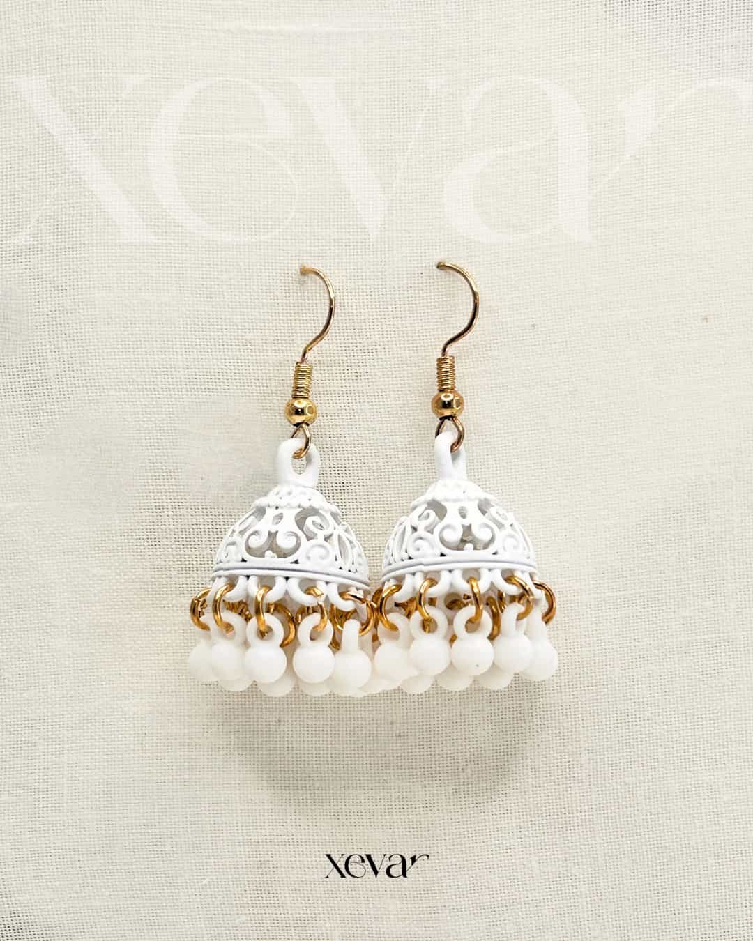 Designed for effortless sophistication, the ivory-white finish is accented by polished gold-toned rings and a swaying fringe of pristine beads. This striking contrast of matte textures and metallic glints makes them the perfect lightweight ethnic jewelry for weddings, festive events, or modern fusion wear. Handcrafted for all-day comfort, the Monochrome Jhumka is your ultimate statement piece for a clean, soft-glam look.