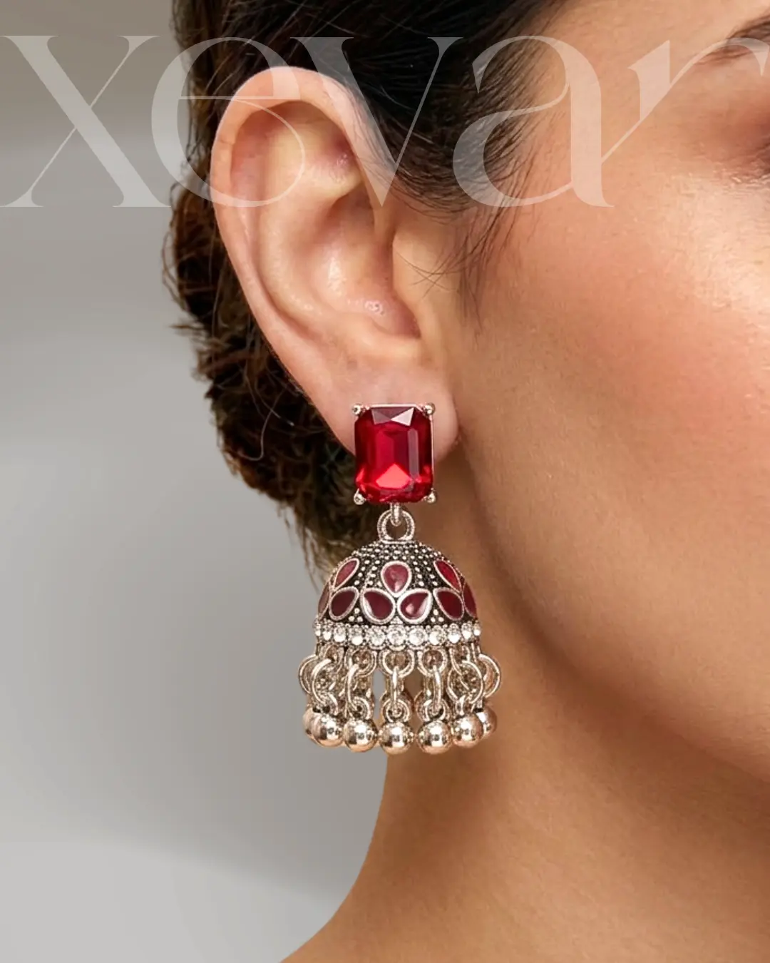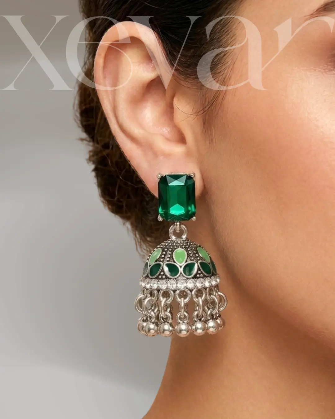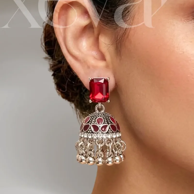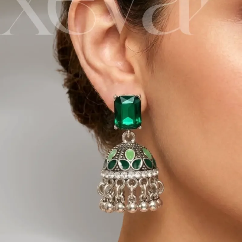 Design Concept: A "Royal Heritage" aesthetic that combines the boldness of a modern gemstone stud with the classic charm of a traditional Jhumki silhouette.
