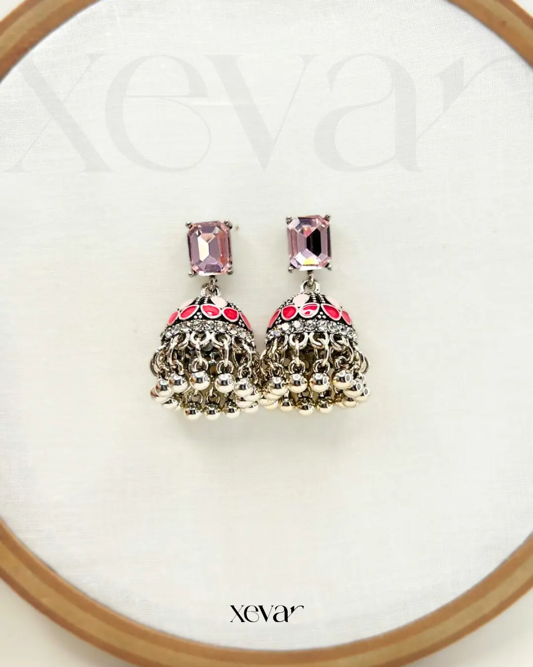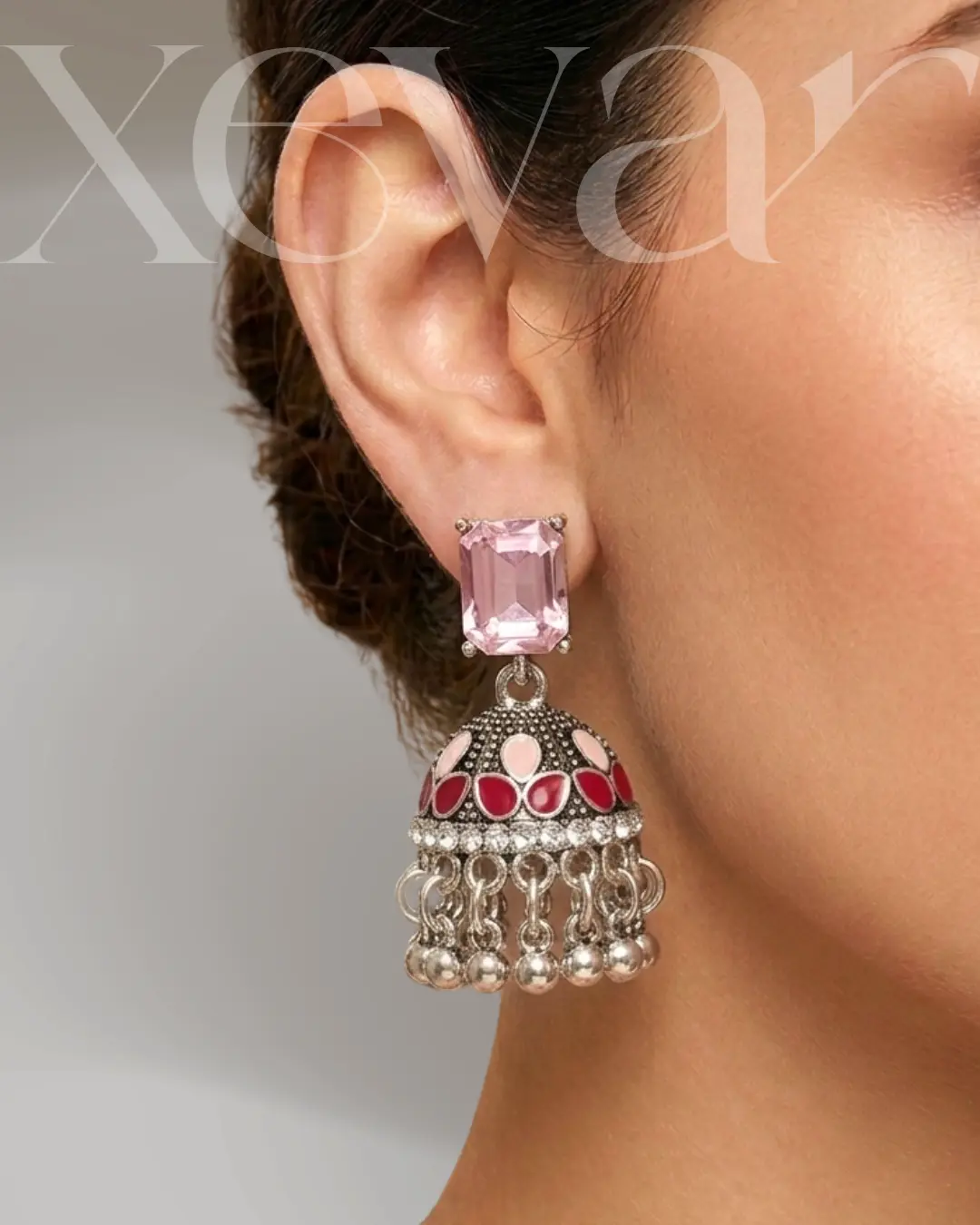 Handcrafted Meenakari Stone Jhumka Earrings with a large crystal top and sliver-plated details for a perfect festive ethnic look.